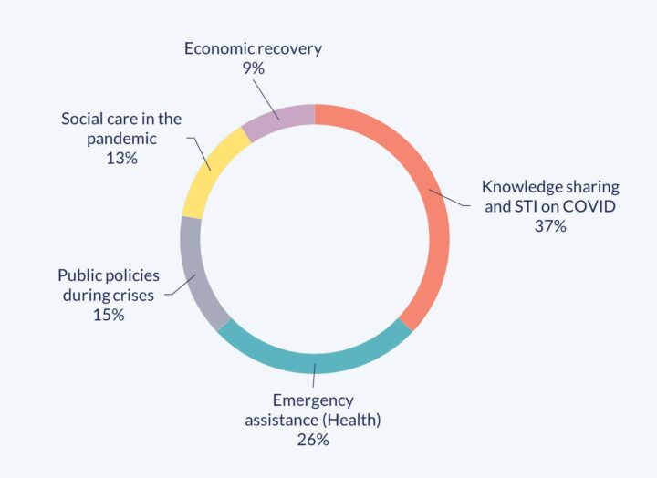 These were closely followed (14 initiatives) by emergency aid, which included donations of medicines, supplies and equipment to face the pandemic. Equally important were the initiatives that focused on public policies in the context of crisis (another 15%), which made it possible to address, for example, best practices for elections, the generation of data and information to improve follow-up and monitoring, in addition to those related to the management of public budgets adapted to the crisis.
