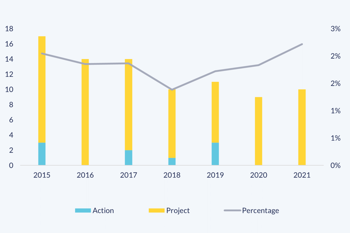 As the first graph shows, Bilateral SSC initiatives for and/or with indigenous peoples in Ibero-America have fallen in the analyzed period: from 17 in 2015 to 10 in 2021, although this drop is smaller if only projects are considered. Its proportion over the total annual Bilateral SSC initiatives reached its minimum in 2018 (1.4%), but steadily increased thereafter, including in the pandemic years, with a maximum of 2.2% in 2021.