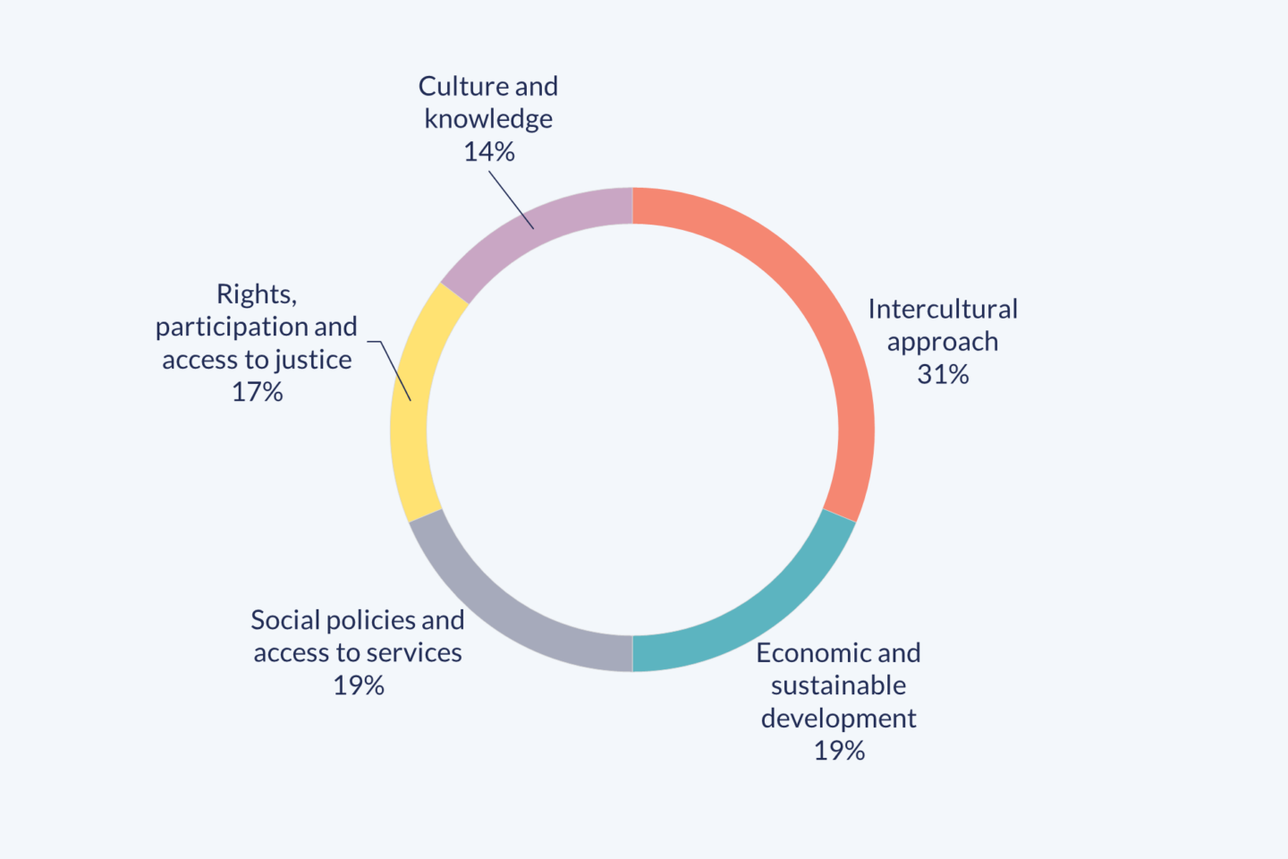 As for the topics that were addressed (see the second graph), 31% of the initiatives can be grouped considering an Intercultural approach to public policies (mainly health and intercultural education), but also based on their cross-cutting impact on public management and planning. Economic and sustainable development issues followed as well as Social policies and access to services, each with almost one-fifth of the total.