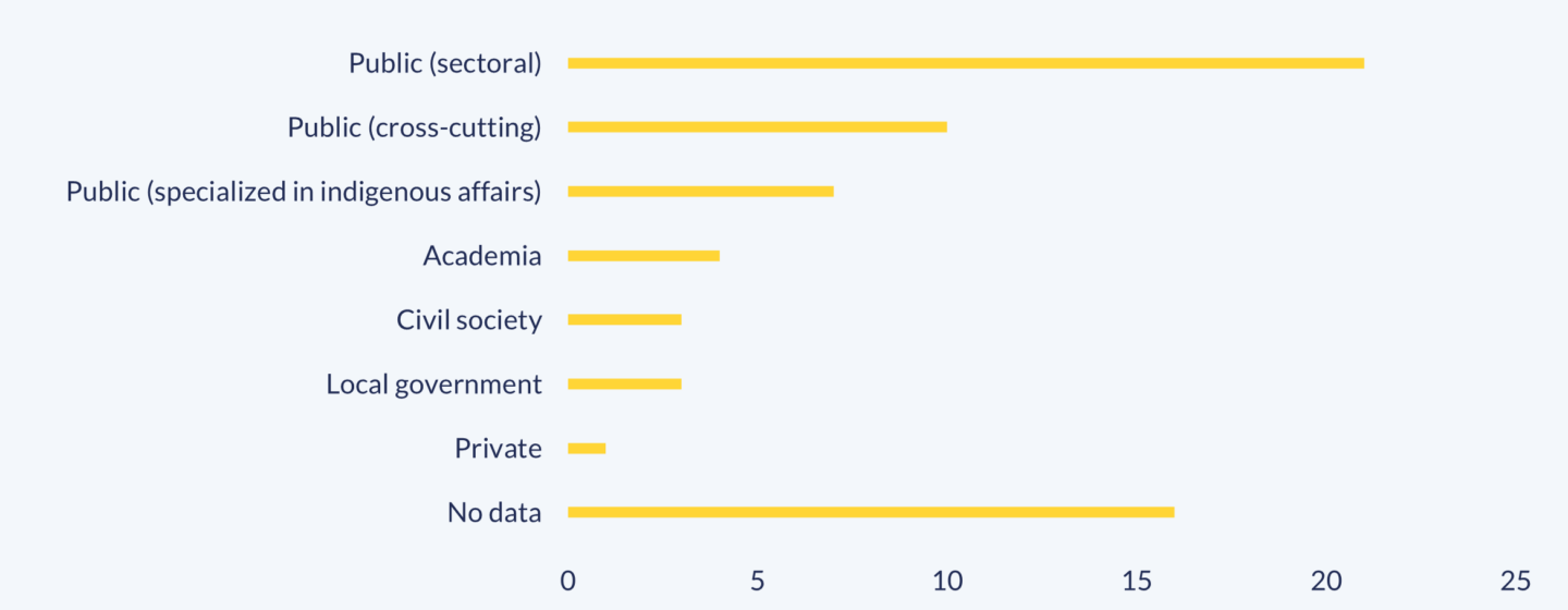 The third graph focuses on the type of stakeholders that participated in the initiatives. In this sense, as the graph shows, indigenous organizations only participate in 1 initiative out of 48, while most of them are implemented by public institutions, whether sectoral, cross-cutting or specialized in indigenous affairs. Academia, civil society, local governments and the private sector also participate in this cooperation although to a much less extent.