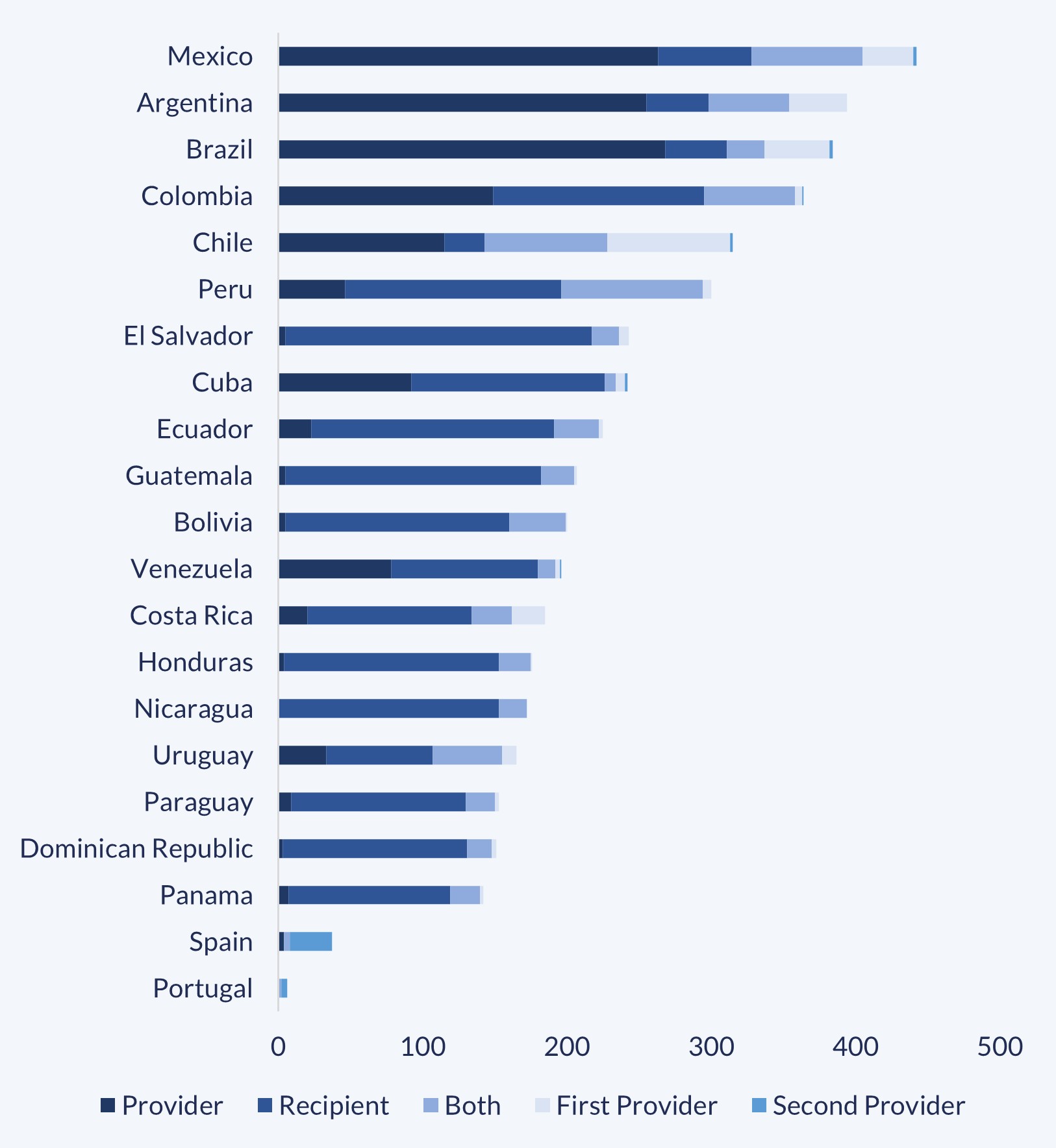 The majority of the most dynamic countries participated as providers in this cooperation, Colombia and Peru being the only exceptions. The former predominantly had a dual role, combining its participation as provider and recipient, while the latter mainly stood out as recipient.