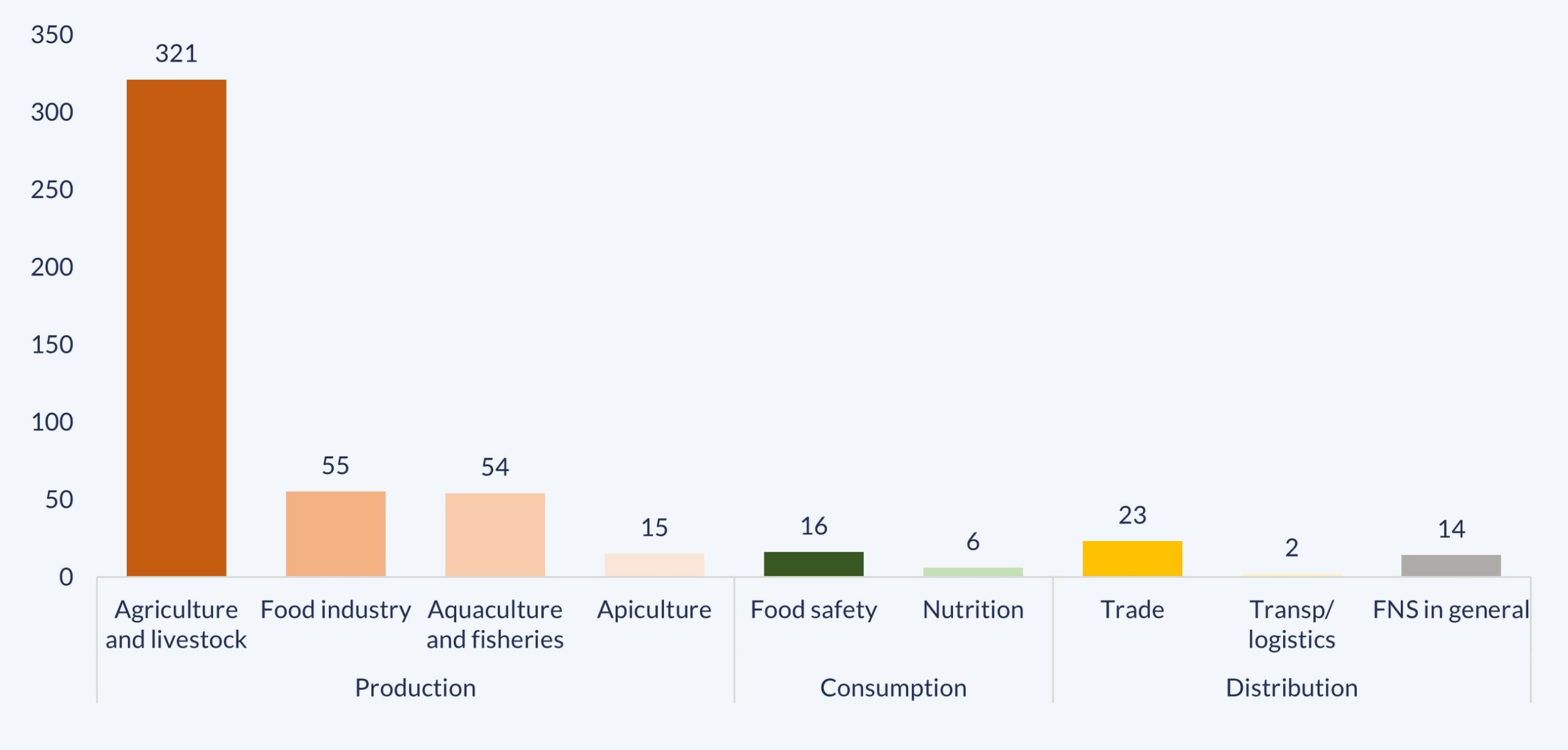 In order to explain how Ibero-American SSC has responded to this challenge, the following graph distributes the 506 initiatives that between 2015 and 2023 addressed FNS, according to their thematic priorities. Eighty-eight percent of the exchanges (445) focused on strengthening Production, and those dedicated to Distribution (25, corresponding to 5%), Consumption (22, accounting for 4.3%) and FNS in general (14, representing 2.7%) were more specific. These 445 initiatives aimed to support the Agriculture and livestock (72%) sector and, to a less extent, Food industry (12.4%); Aquaculture and fisheries (12.2%); and Beekeeping (3.4%).