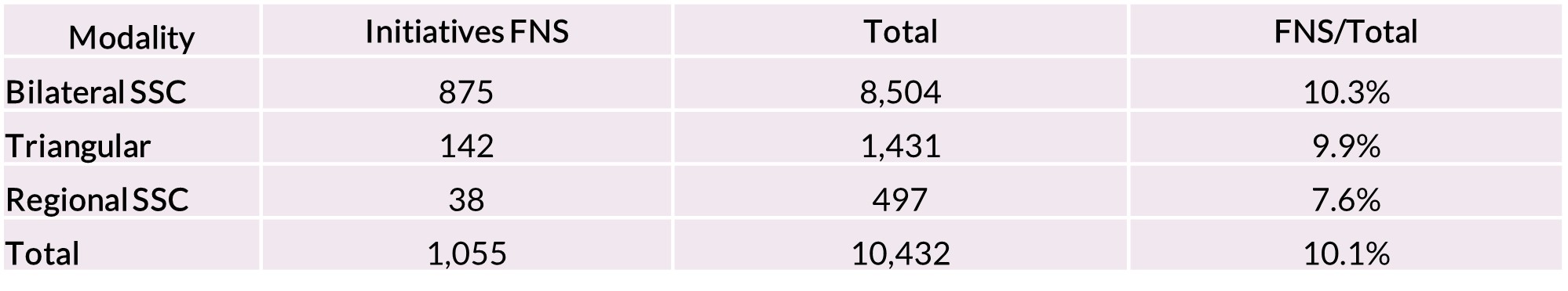 Intense efforts are being made, at the national and local levels, to address this challenge, and international cooperation —particularly South-South and Triangular Cooperation— can be an effective instrument to tackle it. As shown in the following chart, between 2007 and 2023, Ibero-American countries have implemented 1,055 initiatives that focused on FNS, corresponding to 10% of the region’s total cooperation. By modality, cooperation on FNS accounted for around 10% of Bilateral and Triangular exchanges, and represented 7.6% of Regional SSC initiatives.