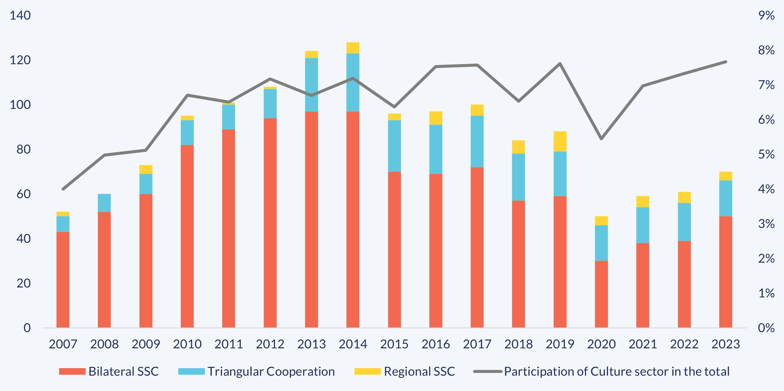In terms of its evolution over time, the first graph shows the initiatives that were associated with culture, by cooperation modality, and their share in the total number of exchanges in the analyzed period. The graph confirms the clear prevalence of Bilateral SSC over the Triangular and Regional modalities. It also shows a steady growth in cooperation to strengthen this sector: specifically, its participation increased from 4% in 2007 to almost 8% in 2023. This trend has remained constant throughout the entire period, with the exception of the most severe years of the COVID-19 pandemic (2020-2021).