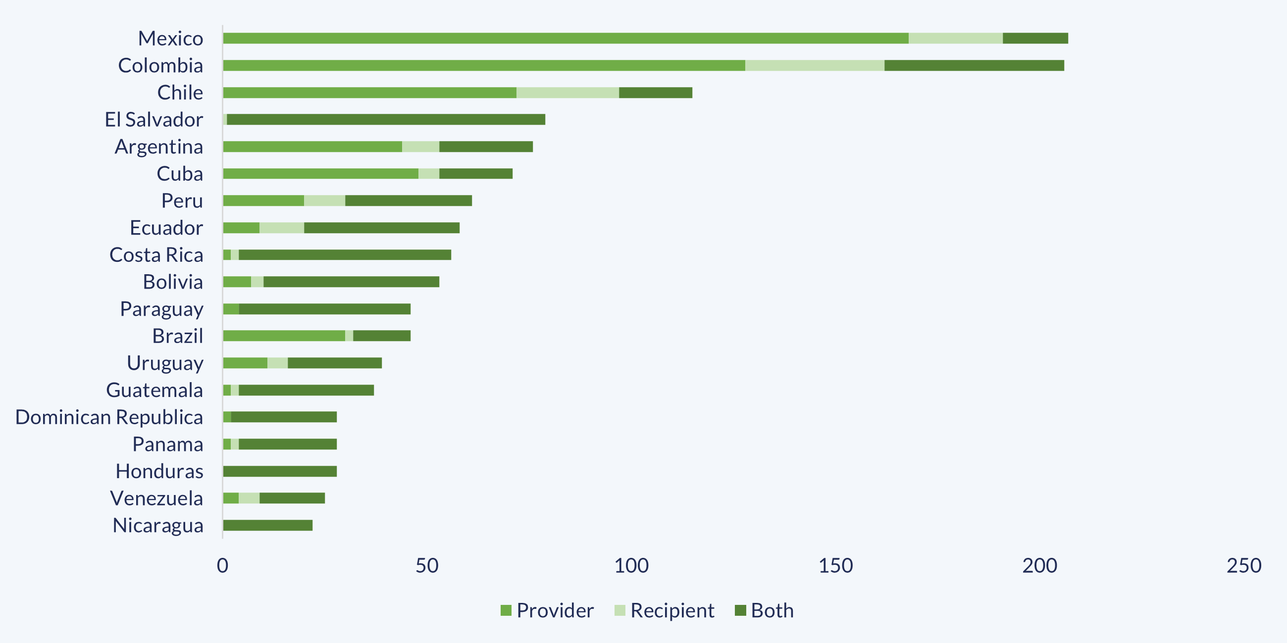 The third graph shows countries’ participation in Bilateral SSC initiatives in the culture sector and their role in this cooperation. The list is led by Mexico and Colombia, for which the provider role prevailed, in most cases.