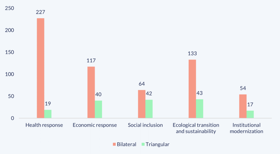 This exercise is carried out considering the 766 and 161 South-South and Triangular cooperation projects, respectively, which were implemented in Ibero-America in 2018 and 2019. The graph shows their distribution according to their potential contribution to the health, economic and social response which, in turn, is considered to be sustainable and that it contributes to improve those institutions that must be the backbone of all future action.