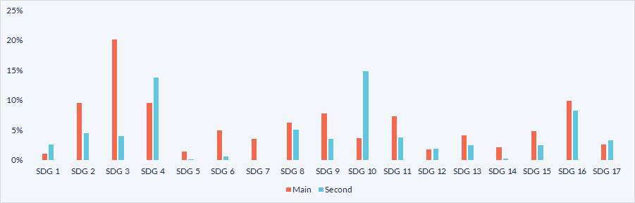On the other hand, in about 70% of the cases, initiatives simultaneously contributed to a second SDG. As the graph shows, SDG 10 (Reduced inequalities), identified as a second SDG in almost 15% of the initiatives, SDG 4 (14%) and SDG 16 (8%), stood out in this sense.