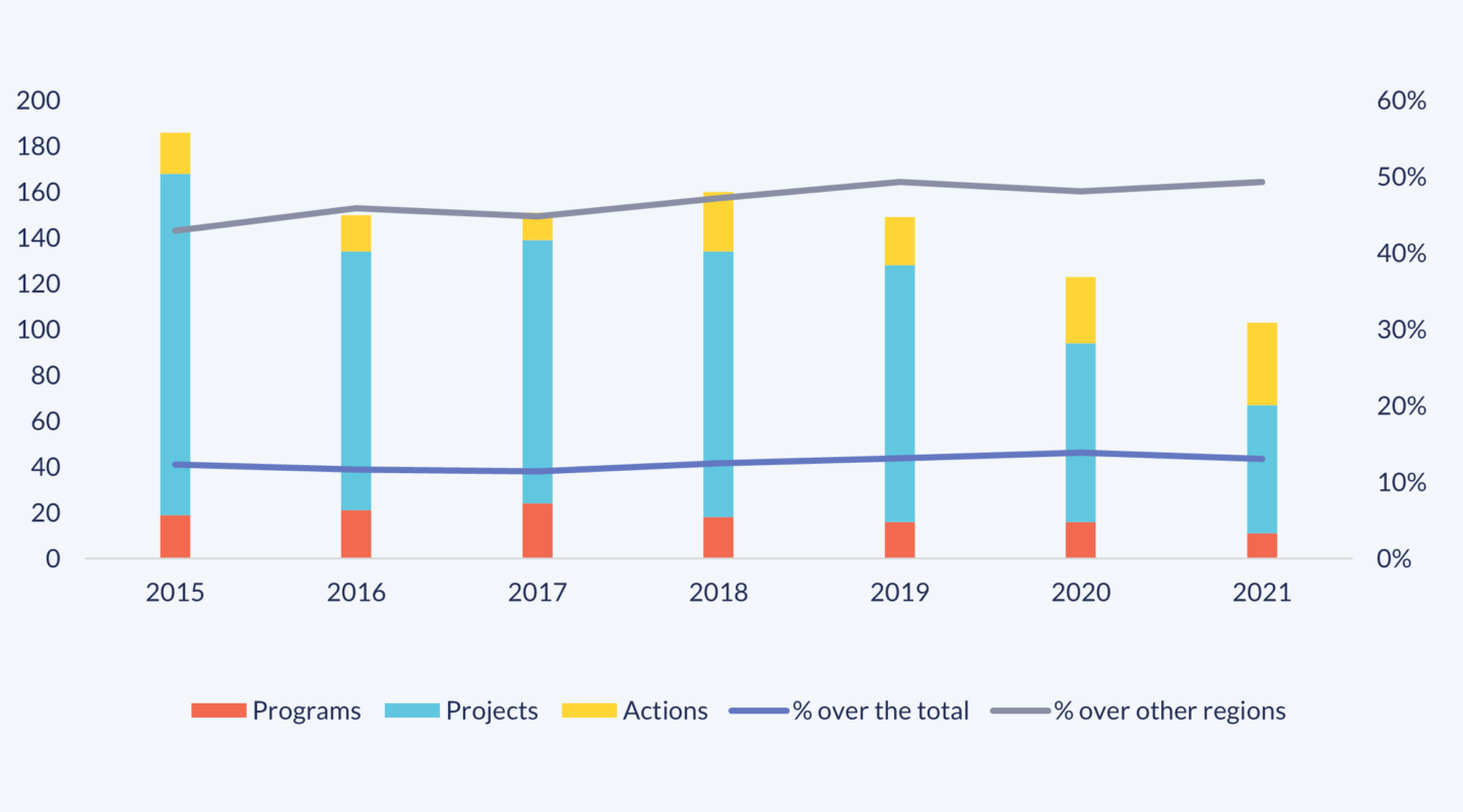 The first of the graphs below shows that, since 2018, the total number of initiatives with the non-Ibero-American Caribbean has fallen. However, this was also the case of all Ibero-American South-South and Triangular Cooperation. As a result, the percentage over the total has remained stable (around 10%). Likewise, the distribution by type of instrument has varied over time and, in 2020-2021, the proportion of actions is higher than that of projects and programs, which seems consistent with the response to the COVID-19 pandemic.