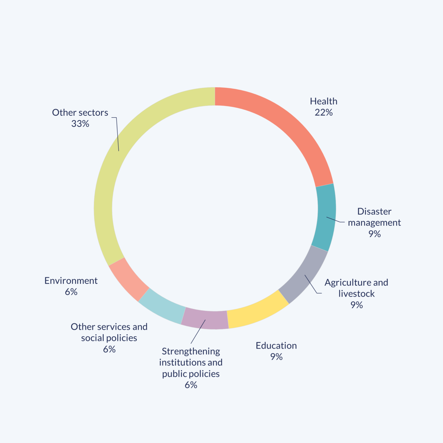 In sectoral terms (see the second graph), cooperation with the non-Ibero-American Caribbean mainly focused on Health (22%), a sector that has a higher importance than in South-South and Triangular Cooperation as a whole during this same period. This is also the case of Disaster management and Education, which rank second, together with Agriculture and livestock (9%), while their incidence is 3.6% and 6.1% in overall cooperation, respectively. In contrast, although Agriculture and livestock and Strengthening institutions and public policies concentrate a large number of initiatives (9% and 6% respectively), they have had a lower share than in Ibero-American South-South and Triangular Cooperation as a whole between 2015 and 2021 (12% and 8%).
