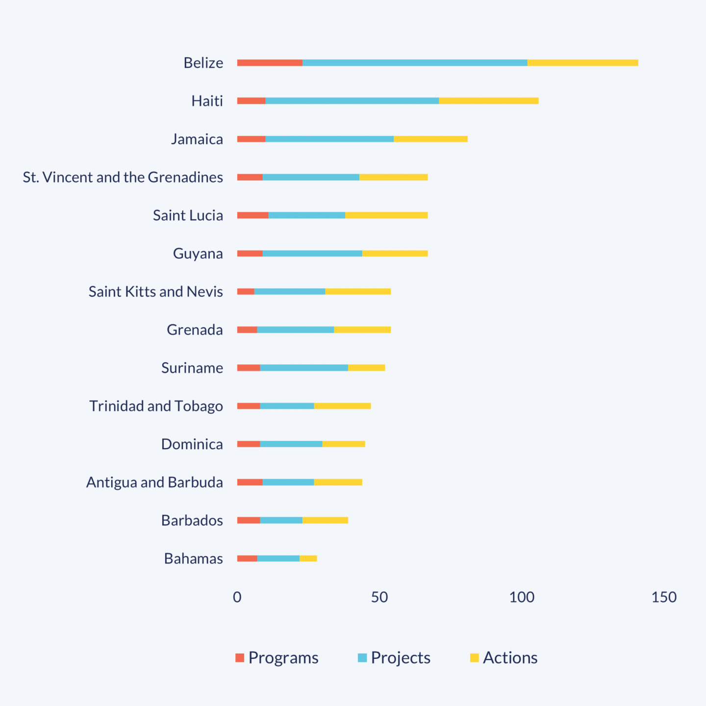 Between 2015 and 2021, Ibero-American countries participated in 438 South-South and Triangular Cooperation initiatives together with non-Ibero-American Caribbean nations, exercising different roles. These correspond to 33 programs, 254 projects and 151 actions. Seventy percent of these are Bilateral exchanges, 19% are Regional and 11% are Triangular. In this sense, the proportion of Regional initiatives with the non-Ibero-American Caribbean is higher than Regional SSC’s share in Ibero-American cooperation as a whole (6% for the same period). This seems to be explained by the geographic proximity and by the fact that countries share some regional problems that require shared solutions, which search is often supported by the different multilateral organizations to which they belong (for example: ACS, CARICOM or SICA).
