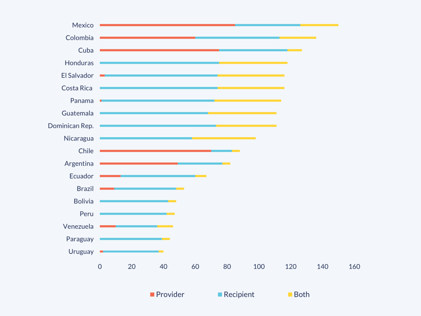 Finally, the fourth graph shows the participation of developing countries in Ibero-America. Three of these stand out for their geographic proximity and clear interest in South-South and Triangular Cooperation with the non-Ibero-American Caribbean: Mexico, Colombia and Cuba; not only as providers but also in other roles. These are followed by all the Central-American countries in addition to the Dominican Republic. Chile and Argentina should also be highlighted as providers.