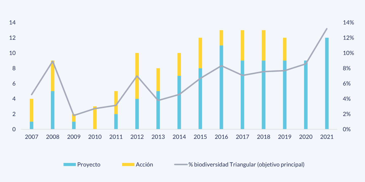 Así, entre 2007 y 2021 se ve que hay un número significativo de iniciativas que apuntan a la biodiversidad y la Triangular es la modalidad que tiene mayor porcentaje de iniciativas con este foco. En concreto, se encontraron 76 iniciativas de Cooperación Triangular con foco en biodiversidad (33 proyectos y 43 acciones) y 160 que podrían hacerlo secundariamente, lo que constituye el 5,6% y el 11,9% del total respectivamente. Es decir, si se suman los porcentajes, el 17,5% de las iniciativas triangulares en el período podrían contribuir de forma directa o secundaria a la protección de la biodiversidad.
