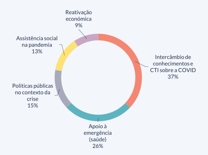 O seguinte gráfico distribui estas 54 iniciativas de acordo com os temas que abordaram. Assim, a maioria das iniciativas promovidas (20,37%) concretizaram-se em intercâmbios de conhecimento, ciência, tecnologia e inovação (CTI) sobre a COVID-19. Destacam-se particularmente os intercâmbios sobre terapias e tratamentos para lidar com a doença, as estratégias epidemiológicas (como as relacionadas com a prevenção e controlo do contágio) e a investigação sobre vacinas.