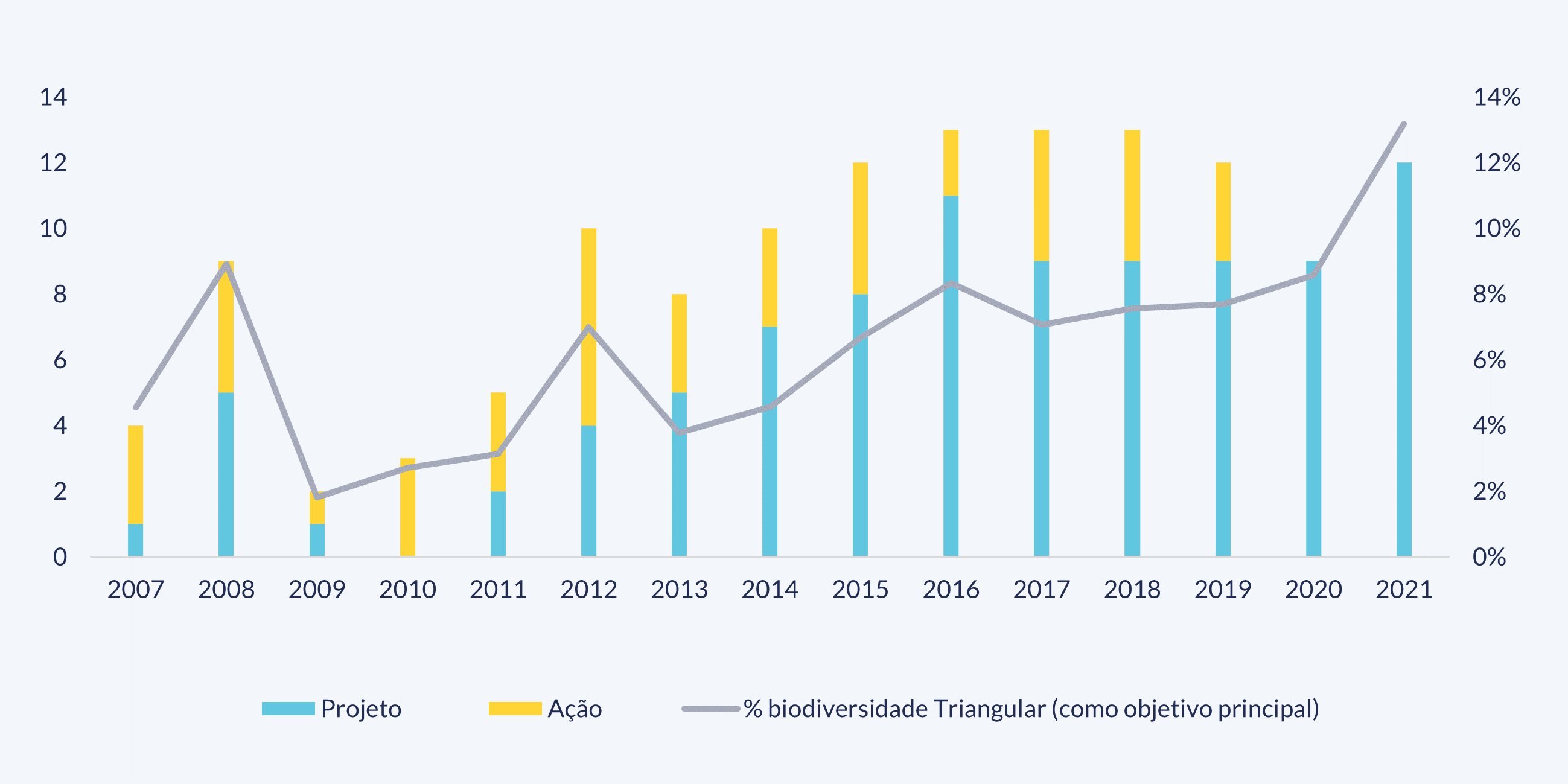 Assim, entre 2007 e 2021 há um número significativo de iniciativas que visam a biodiversidade, sendo a modalidade Triangular a que tem uma maior percentagem de iniciativas com este enfoque. Em concreto, foram encontradas 76 iniciativas de Cooperação Triangular centradas na biodiversidade (33 projetos e 43 ações) e 171 que o fizeram de forma secundária, o que representa, respetivamente, 5,6% e 12,7% do total. Por outras palavras, se somarmos as percentagens, 18% das iniciativas triangulares desse período puderam contribuir de forma direta ou secundária para a proteção da biodiversidade.