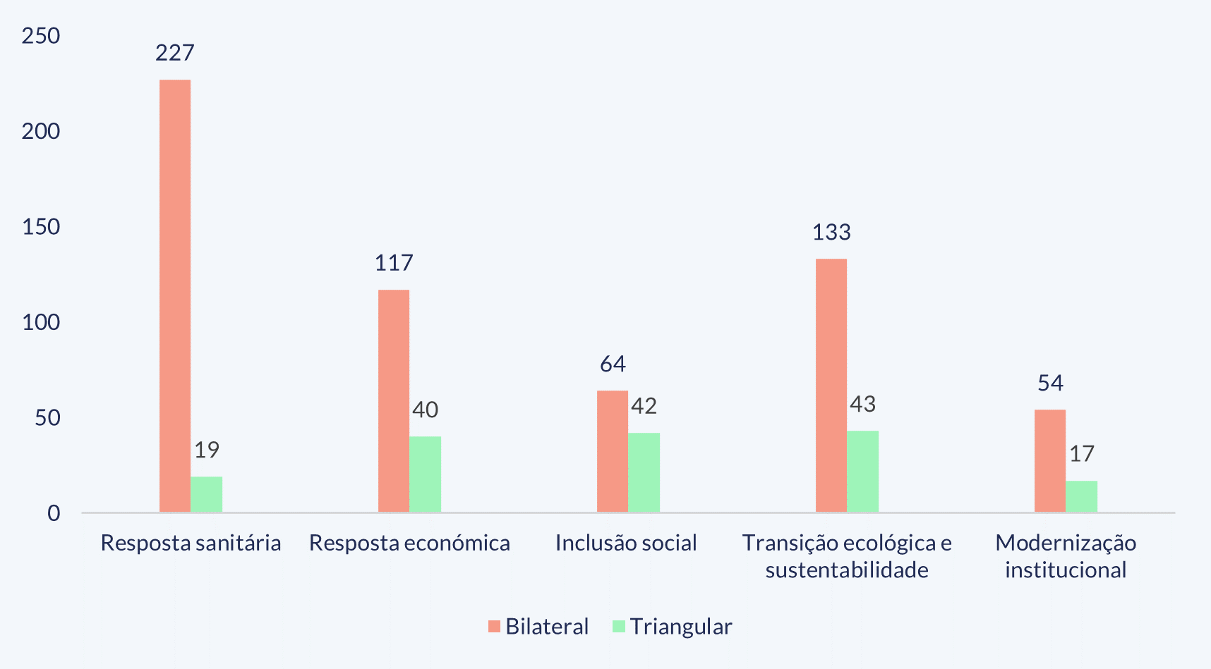 Este exercício é realizado com base nos 766 e 161 projetos em execução nos anos 2018 e 2019 na Ibero-América, sob as respetivas modalidades de CSS Bilateral e Triangular. O gráfico mostra a sua desagregação de acordo com a sua potencial contribuição para a resposta sanitária, económica e social, que por sua vez é sustentável e moderniza instituições que devem estar na base de todas as ações futuras.